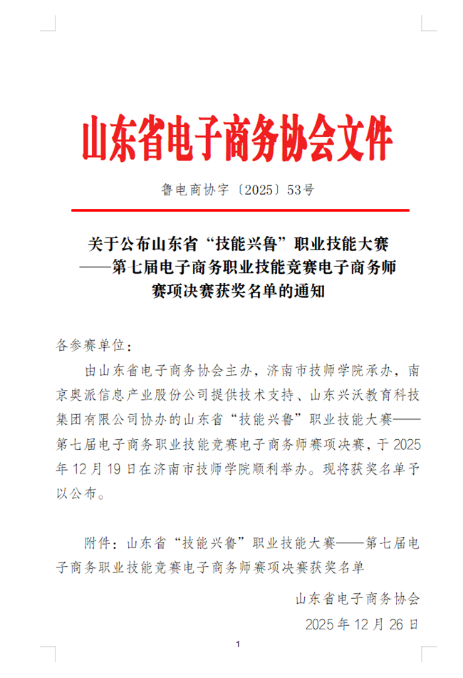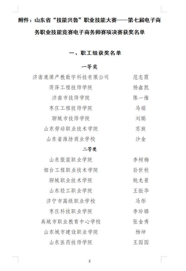 关于公布山东省“技能兴鲁”职业技能大赛一一第七届电子商务职业技能竞赛电子商务师赛项决赛获奖名单的通知