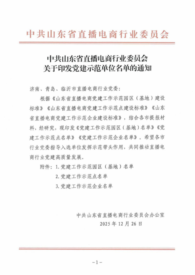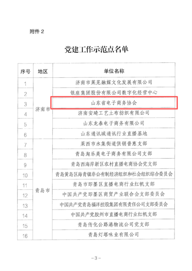 近日,中共山东省直播电商行业委员会印发《关于印发党建示范单位名单的通知》,山东省电子商务协会凭借扎实的党建工作基础、突出的行业引领作用,成功入选党建工作示范点名单,成为全省直播电商领域党建与业务深度融合的标杆典范之一。